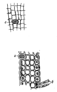 А — часть пластины, вид с поверхности; Б — поперечный срез с одноклетными спорангиями (а) и волоском (б) Пластина ланцетовидная, простая, до 13 см высоты и 0,5 см ширины. На поперечном срезе пластина состоит из 4—7 рядов крупных прямоугольных клеток и одного ряда коровых клеток. Одноклетные и многоклетные спорангии развиваются из клеток корового слоя, погружены в него, слегка выступая над поверхностью. Растет на камнях, на литорали, довольно редкий вид.