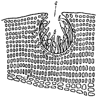 Срез через слоевище: а — концептакул; б — тетраспорангииБ в — парафизы Слоевище в виде пленки до 0,5 мм толщиной, плотно прикрепленное к субстрату. Тетраспорангии развиваются в концептакулах. Растет на камнях на литорали и в сублиторали. Вид широко распространен на Мурманском побережье.
