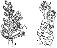 А — верхушка слоевища с параспорами (а) (Зинова, 1955); Б — сперматангии на концах веточек (б)