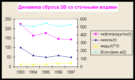 По сравнению с 1996г. отмечено уменьшение сброса хлоридов, сульфатов, сухого остатка, нефтепродуктов, азота нитритного, никеля, меди, кобальта, в основном, за счет снижения объемов сброса сточных вод.