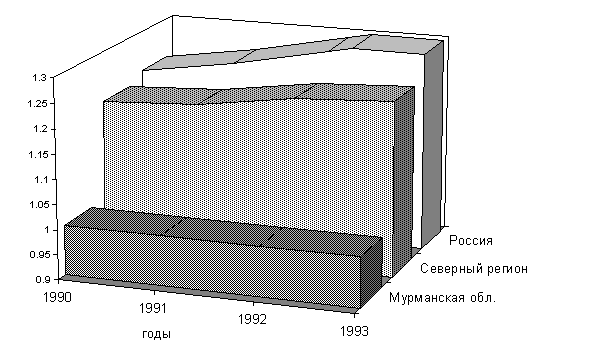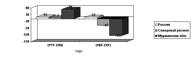 Так, если в 1979 году средний ежегодный темп прироста населения в области составлял +1.9% против +0.5% по России в среднем, в 1989 году соответственно +1.9% и +0.7%, то, начиная с 1992 года, в Мурманской области началось увеличение темпа снижения численности населения, который составил - 1.0%, в 1993г. - -2.7%, в 1994г. - - 2.3%, в 1995г. - -2.3%, в 1996г. - -1.7%, при средне российском показателе за 1995г. - 0.1%. Население Мурманской области всегда было моложе, чем в других регионах РФ, что обуславливалось высоким уровнем миграционных процессов. Вместе с тем неблагоприятные тенденции в социально-экономической и демографической ситуации за последние годы повлияли и на возрастную структуру населения области. Удельный вес детей в структуре населения снизился с 25% в 1979 году до 20% в 1997, удельный вес лиц старше 50 лет за этот период увеличился с 12% до 20%.