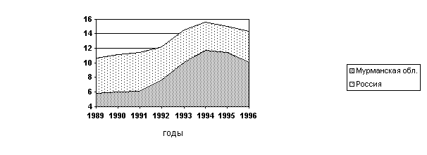 Данный показатель является важнейшим интегральным показателем, рекомендованным Всемирной Организацией Здравоохранения (ВОЗ) в качестве критерия состояния здоровья и уровня жизни населения того или иного региона. Состояние здоровья и тенденция смертности населения Мурманской области адекватно проявляются в показателях СППЖ. Несмотря на некоторое увеличение показателя СППЖ за последние два года его уровень в 1996 году по-прежнему ниже величин конца 80-х годов. Так, в сравнении с 1989 годом в 1996 году показатель СППЖ в Мурманской области ниже на 4.3 года, в том числе у мужчин - на 5.3 года, у женщин - на 2.3 года.
